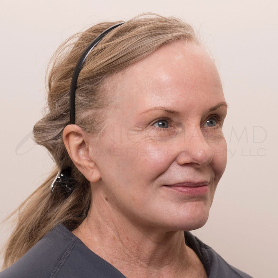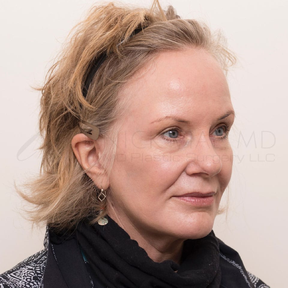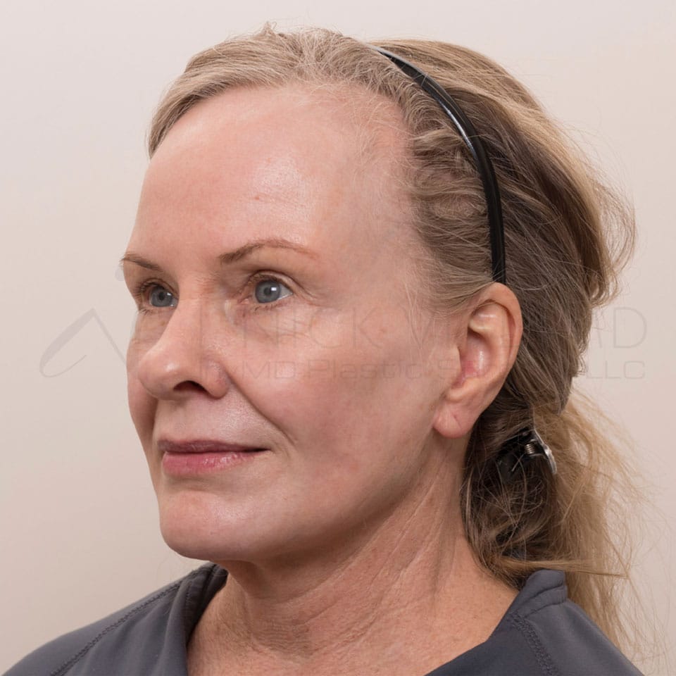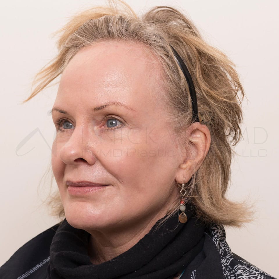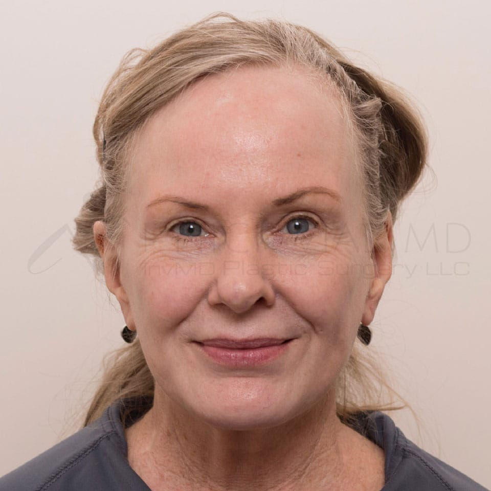 Patient in their sixties unhappy with skin wrinkles. Underwent phenol peel. Photos with and without makeup five years after peel.